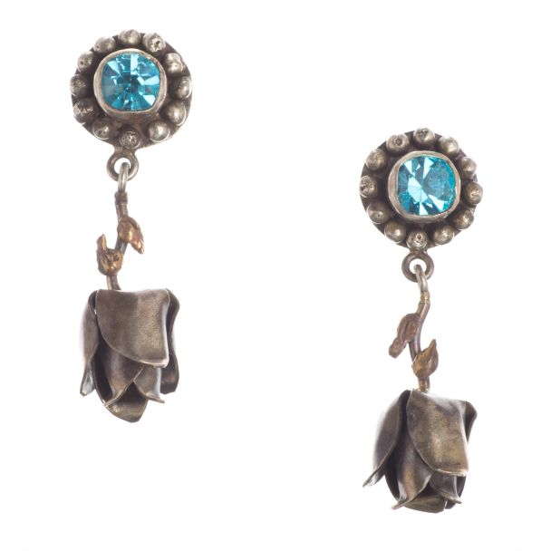 Barbosa Earrings - Vibrant Aqua Crystal Post with Silver Dangling Roses