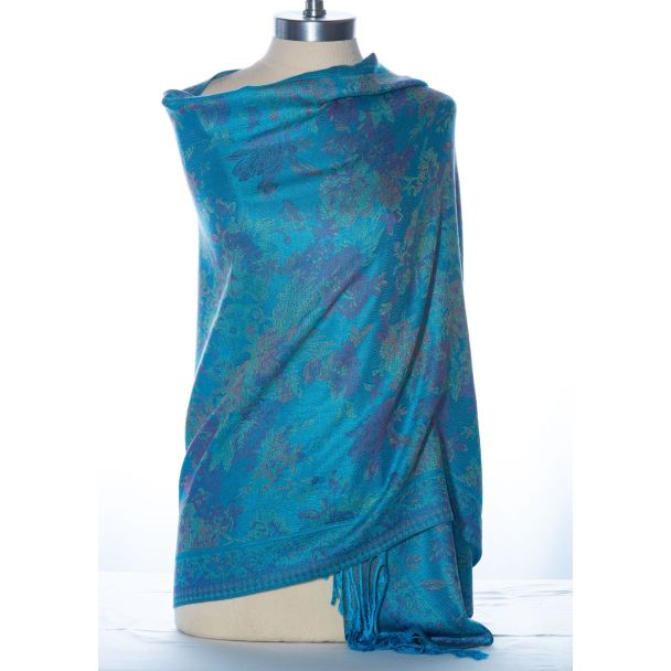 Fabulous! Silk & Pashmina Floral Shawl Wrap by Rapti Fashion - Turquoise