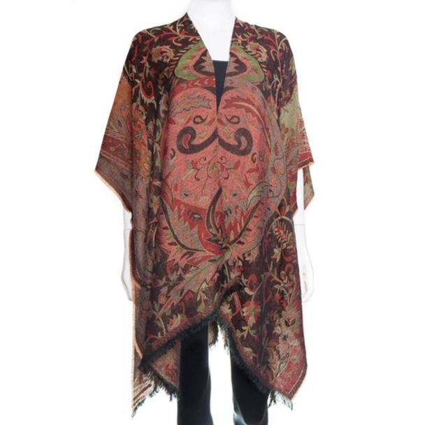 ROYAL PAISLEY RUANA SHAWL - This bold and daring ruana jacket makes a dramatic statement with its deep colors and vibrant paisley and floral print. Jacquard-woven ruana is edged with 1/2" delicate fringe at the hem. Open front, stitched arm-holes, Hangs 33 1/2", longer on sides. One size fits most.