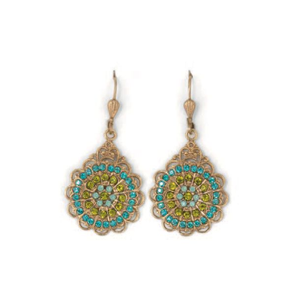 Catherine Popesco Gold Round Filigree Crystal Earrings - Teal & Olivine
