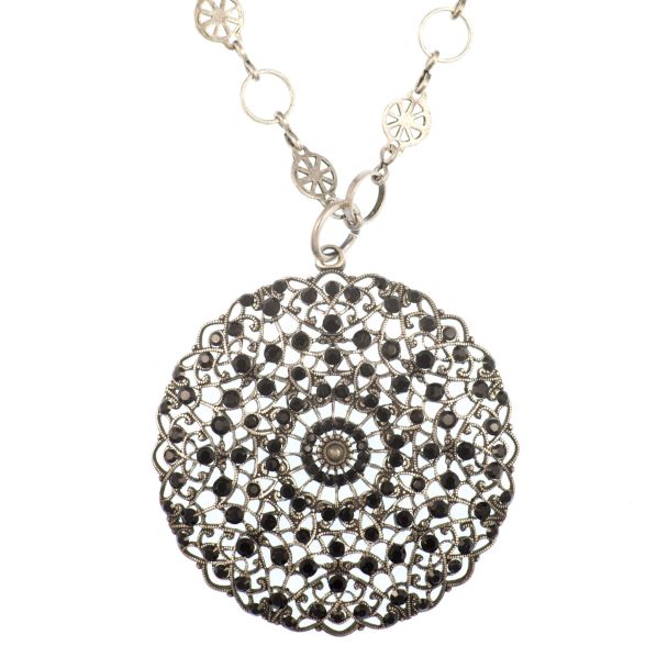 Catherine Popesco Large Lacy Jet Black Crystal Medallion Silver Crystal Necklace