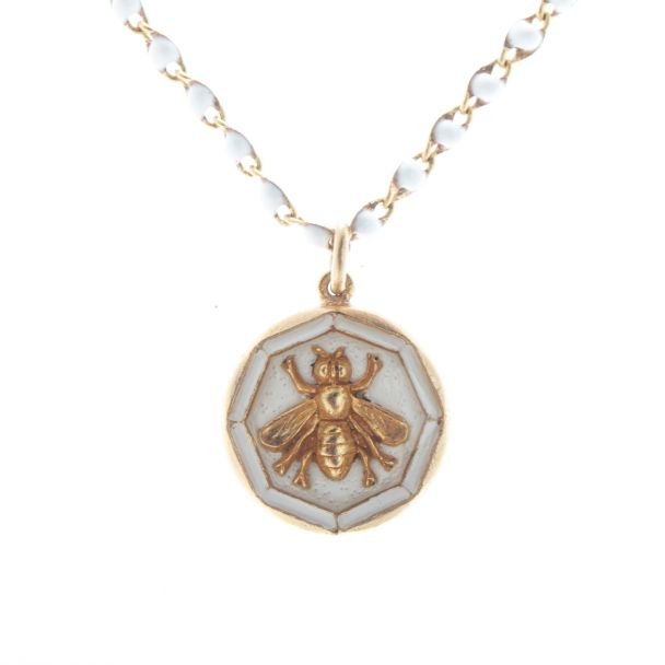 Catherine Popesco White French Enamel Round Bee Pendant Necklace