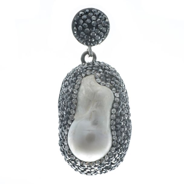 The unique shaped pearl is surrounded in sparkly hematite stones with a ring of clear Swarovski crystals.