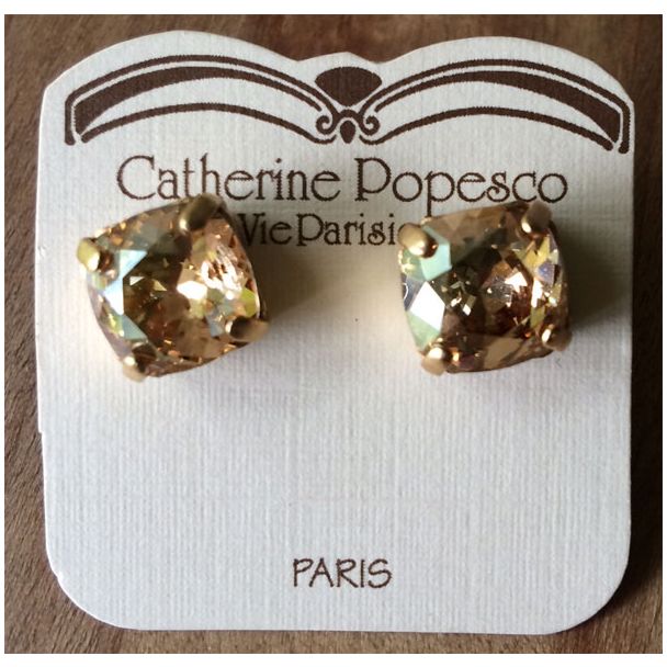 Champagne Swarovski Crystals14 K Gold Plated Setting3/8" by 3/8"Also available in ice, teal, pacific opal, marine, midnight blue, champagne, smokey quartz, khaki, rosewater, tanzanite, lavender, white alabaster, ceadon, ocean green, stormy and electric blue. Please specify desired color. mfg: La Vie Parisienne Jewelry by Catherine Popesco