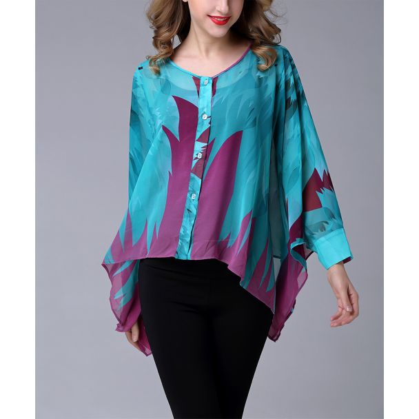 Splash your ensemble with vibrant color and breezy style with this button-up top featuring poncho style sleeves.