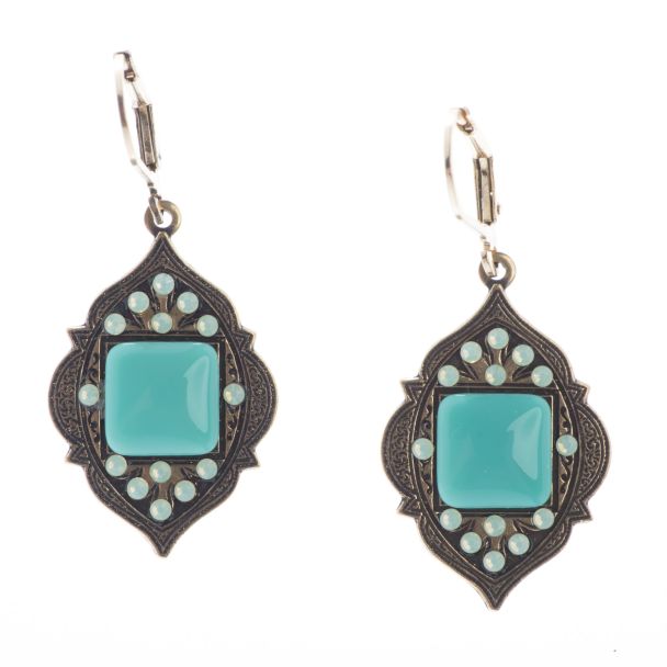 Top Shelf Jewelry Hammered Brass Marquise Square Turquoise and Crystal Earrings
